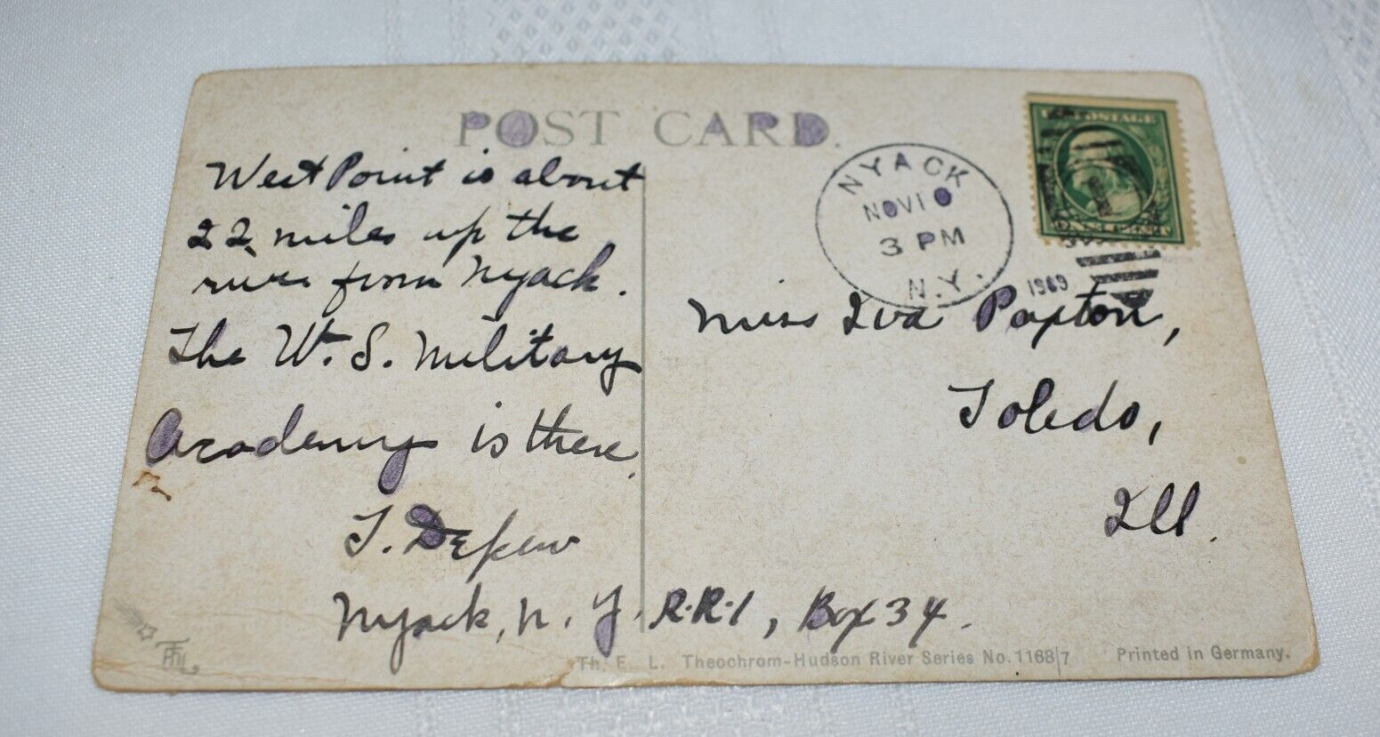 West Point View Up Hudson River Postcard, E. L. Theochrom, Hudson River Series no.1168/7, Printed in GermanyPosted with a green 1-cent Benjamin Franklin stamp. As shown. See photos.Combined shipping is available. See store for related items.