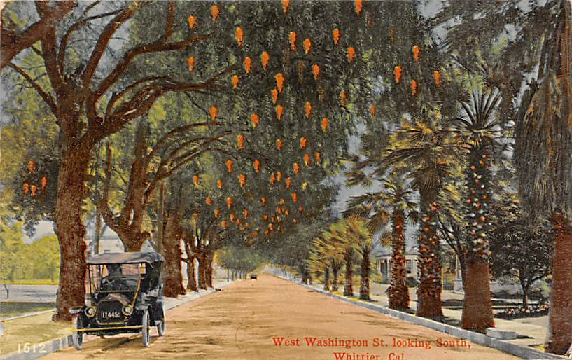West Washington St. looking South Whitter CA Postcard - Unused Grade: 3 Size: R - Regular size: Approx 3 1/2 X 5 1/2 inch (9 cm X 14 cm) Grading Scale: Grade 1 = Perfect corners Grade 2 = Very Minimal corner w ... Read More