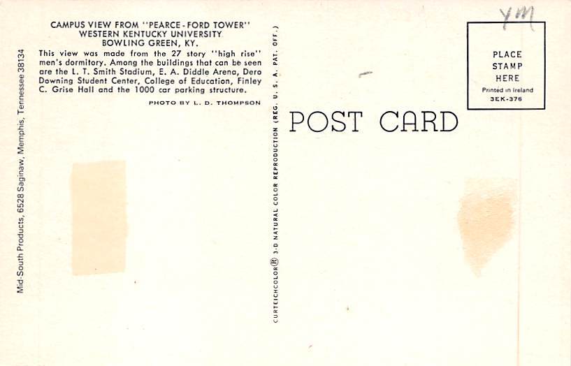 Western KY University Bowling Green KY Postcard - Unused Grade: 1 paper wear on back, tape on back Size: R - Regular size: Approx 3 1/2 X 5 1/2 inch (9 cm X 14 cm) Grading Scale: Grade 1 = Perfect corners Grad ... Read More