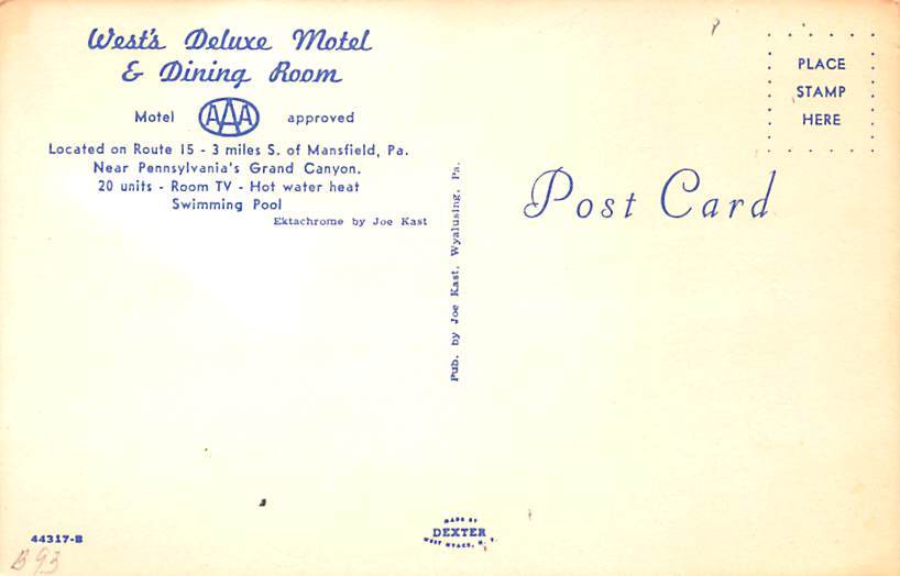 West's Deluxe Motel & Dining Room 3 miles south of Mansfield - Mansfield, Pennsylvania PA Postcard Postal Date: Unused Grade: 1 Size: Regular Size Postcard - approximately 3 1/2 inch x 5 1/2 inch (9 CM x 14 CM) ... Read More