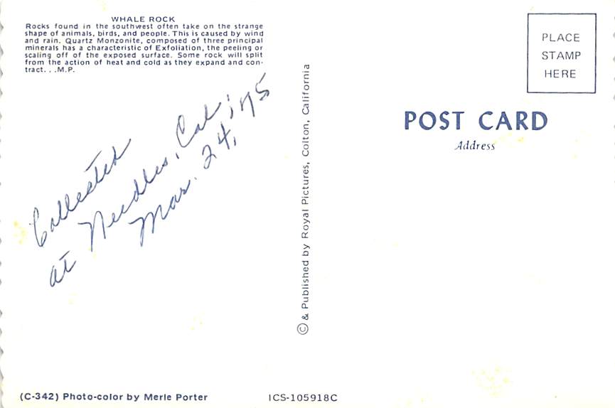 Whale Rock - Needles, California Grade: 2 Category: Continental Size Postcard, Approx 4 in x 6 in (10 cm x 15.25 cm) Product Size: Continental size: 4X6 inches (10.5 cm x 15 cm) Grading Scale: Grade 1 = Perfec ... Read More