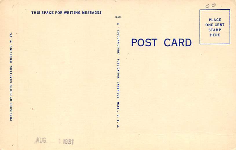 Wheeling showing Ohio River Wheeling showing Ohio River - Wheeling, West Virginia WV Postcard Postal Date: Unused Grade: 3 Size: Regular Size Postcard - approximately 3 1/2 inch x 5 1/2 inch (9 CM x 14 CM) Gra ... Read More