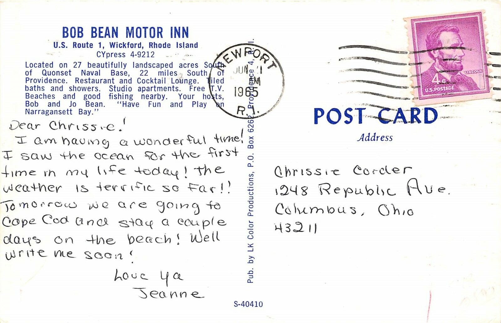 Wickford Rhode Island 1965 Postcard bob Bean Motor Inn