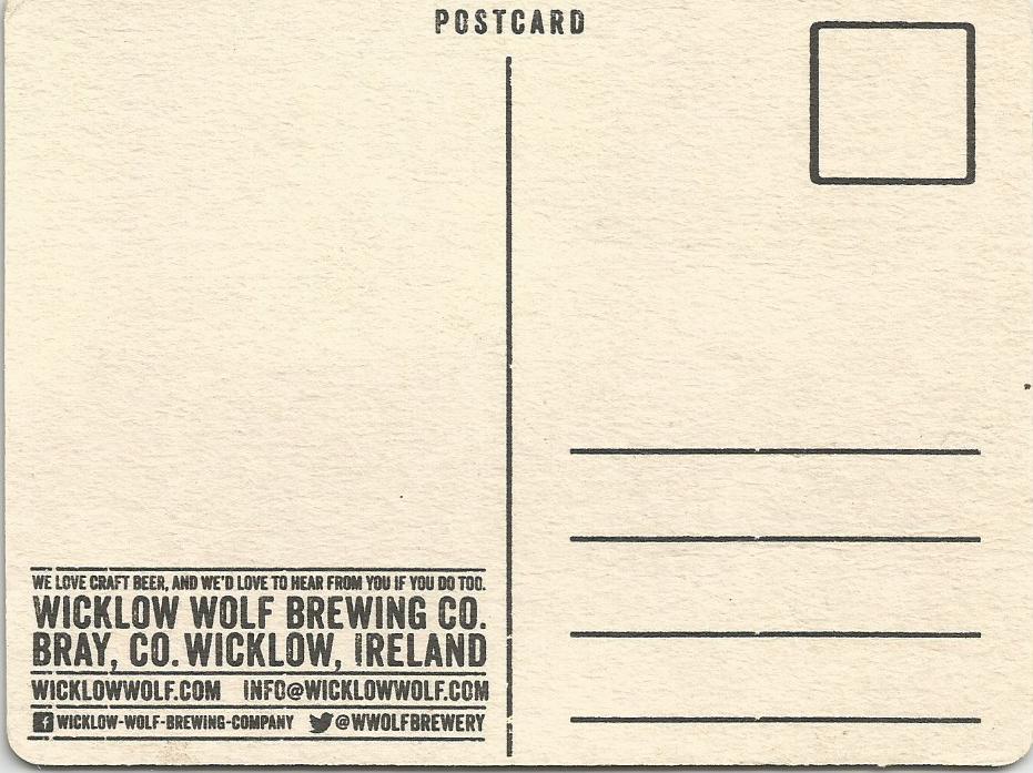 This Irish beer coaster promotes Wicklow Wolf Brewing, a young growing craft brewery in Bray, County Wicklow. Not only are they creative and imaginative in their brewing skills, the coaster also shows creative imagination in that it can also double as a postcard.This postcard will be mailed to the buyer.