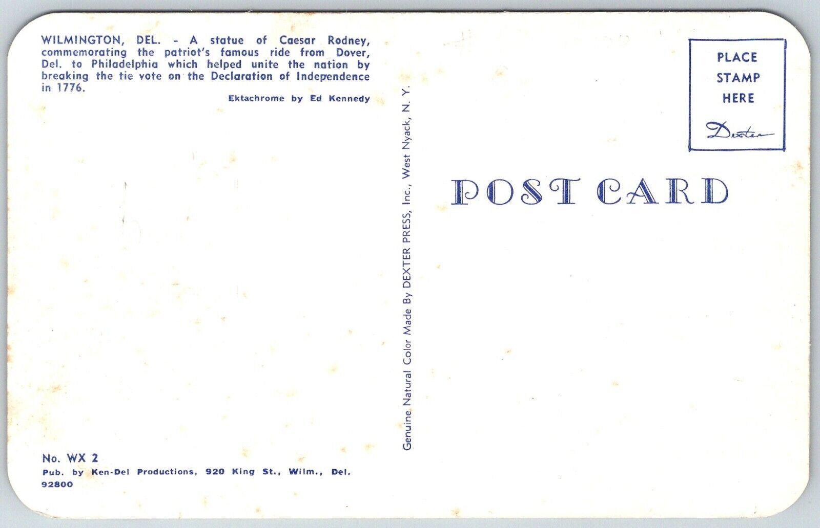 Wilmington Delaware 1950s Postcard Caesar Rodney Signer Declaration Statue