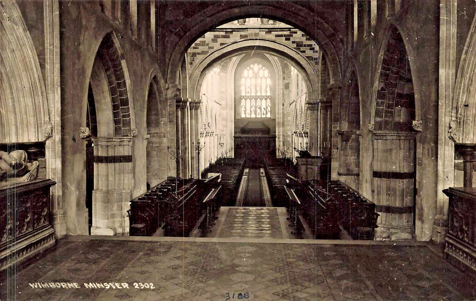 The product is an original real photo postcard featuring an interior view of Wimborne Minster in Dorset, England. The postcard was manufactured in the United Kingdom during the White Border era (1915-1930) and measures a standard size of 5.5 x 3.5 inches. The theme of the postcard focuses on the historic Wimborne Minster in Dorset, providing a unique glimpse into the architecture and beauty of this English city. Ideal for collectors interested in topographical postcards and vintage English landmarks.