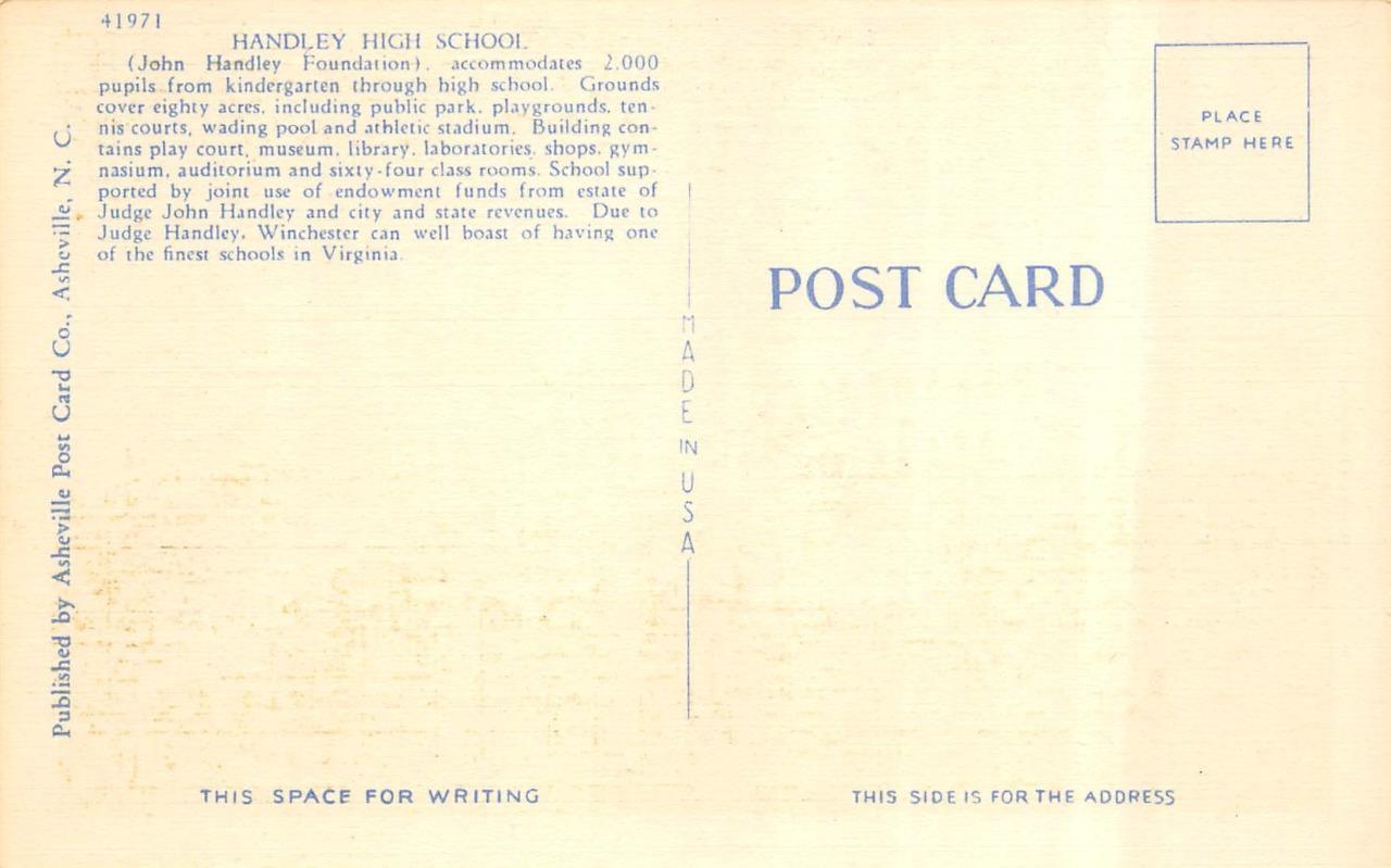 WINCHESTER, VA Virginia HANDLEY HIGH SCHOOL~Night View c1940's Linen Postcard WINCHESTER, VA Virginia HANDLEY HIGH SCHOOL~Night View c1940's Linen Postcard Click images to enlarge Description Please note that if in the image of the postcard back, an odd colored shadow appears on one side, it is a scanner defect and it does not appear on the card. Item is described as accurately as possible. Please View My Other Items For Sale and be sure to Add me to your Favorite Sellers. Please be sure to Visit My Hip Store, new items are listed every week. Please don't hesitate to send me a question, before or after your purchase. I want to make sure your experience is a positive one, and will respond promptly to all inquiries. I only sell standard size vintage postcards, shipped typically within 24 hours, in a cardboard stiffened envelope. I offer a full refund if you are unhappy with your purchase, so please buy with confidence. Images sell!Get Supersized Images & Free Image HostingCreate your brand with Auctiva'sCustomizable Templates.Attention Sellers - Get TemplatesImage Hosting, Scheduling at Auctiva.com.Track Page Views WithAuctiva's FREE Counter