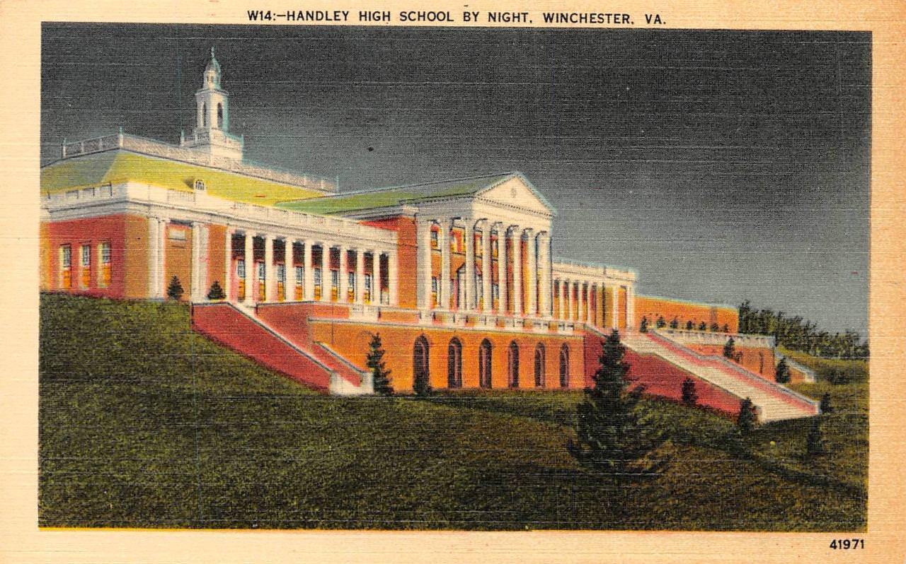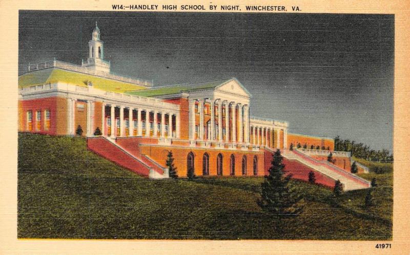 WINCHESTER, VA Virginia HANDLEY HIGH SCHOOL~Night View c1940's Linen Postcard