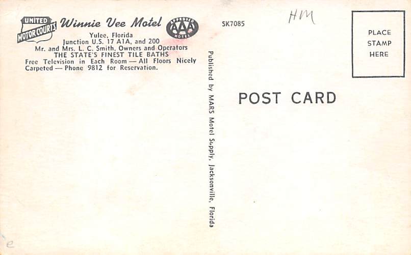 Winnie Vee Motel Fountain Yulee FL Postcard - Unused Grade: 3 Size: R - Regular size: Approx 3 1/2 X 5 1/2 inch (9 cm X 14 cm) Grading Scale: Grade 1 = Perfect corners Grade 2 = Very Minimal corner wear, no cr ... Read More