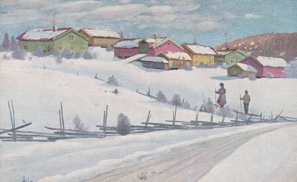 ts255 A very old painting postcard of Winter in Norway used some small places to allow and mildly aged graded vg