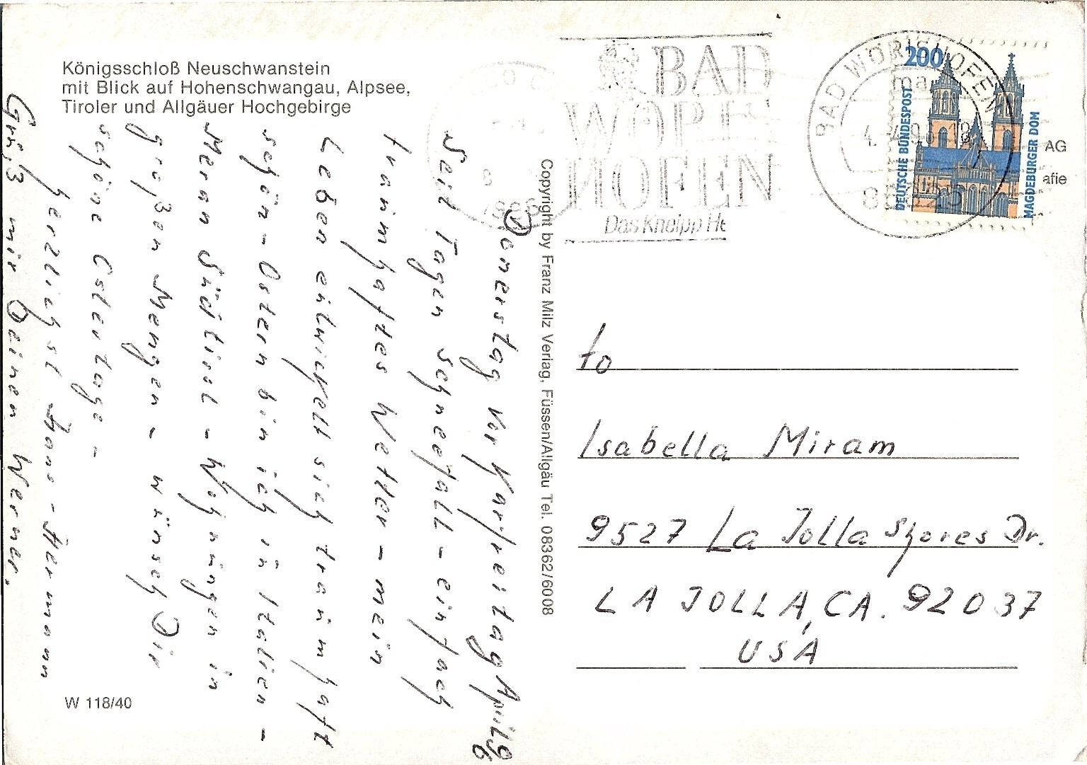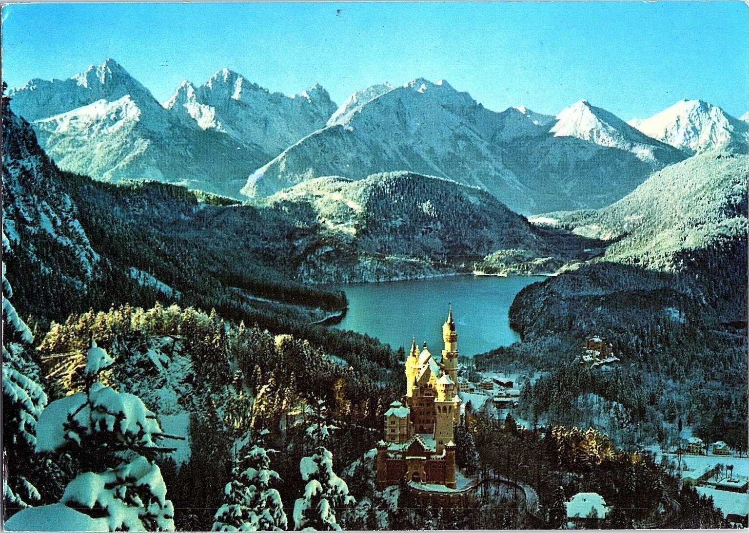 This vintage photochrome postcard from the 1960s showcases the iconic Neuschwanstein Castle (model for Disney's Cinderella's Castle), nestled amidst the snowy Bavarian Alps near Hohenschwangau, Germany. The lithograph print captures the castle's fairy-tale architecture contrasted against majestic mountain peaks and a serene alpine lake, highlighting its scenic beauty during winter. Published by Franz Milz Verlag of Füssen/Allgäu, this licensed reprint postcard features rich, vibrant colors typical of mid-20th century photochrome technology. The back reveals handwritten German script and a postal stamp from Bad Wörishofen, adding to its authenticity and collectible value. This postcard is a superb choice for collectors of European landmarks, vintage travel ephemera, or historic German sites.