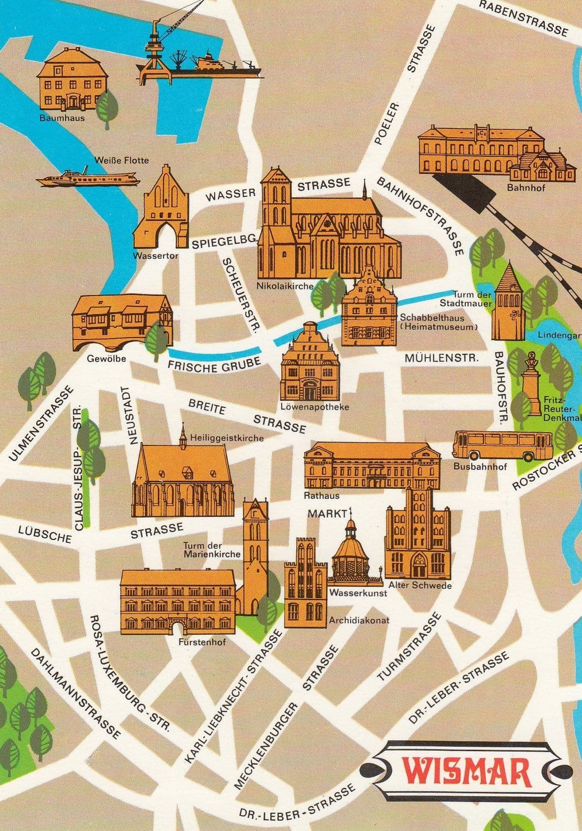 994 An undated but circa 1980s postcard of a map of Wismar with its main sights as miniature drawings and all its main road names in near mint condition unused too