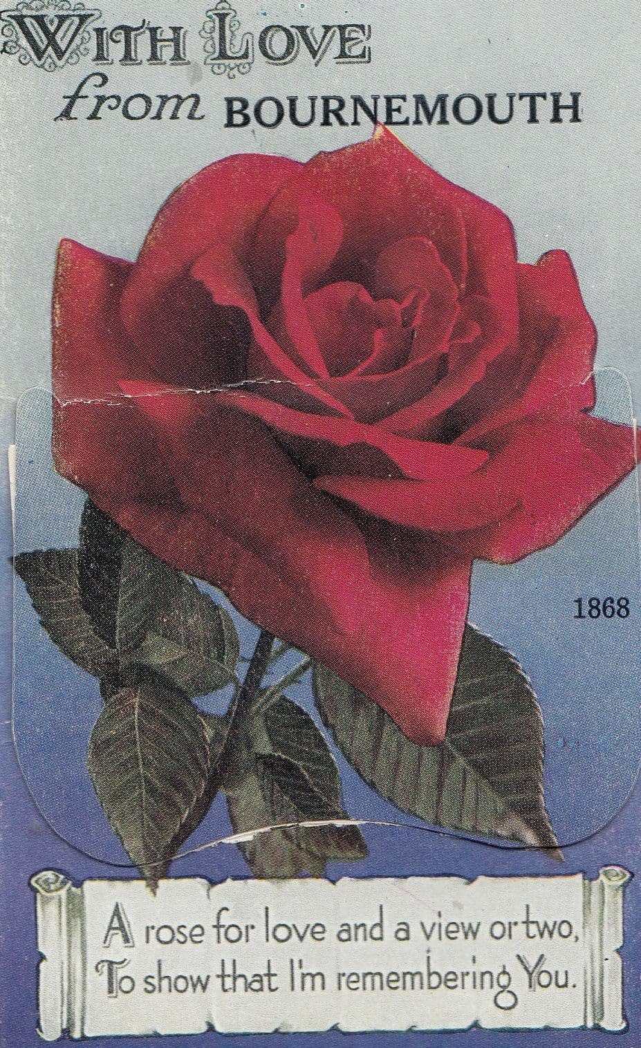 857 This circa 1920s to 1930s vintage mailing novelty postcard from Bournemouth is used but mostly great condition - flap opens and lots of small photos of Bournemouth are housed in the rose