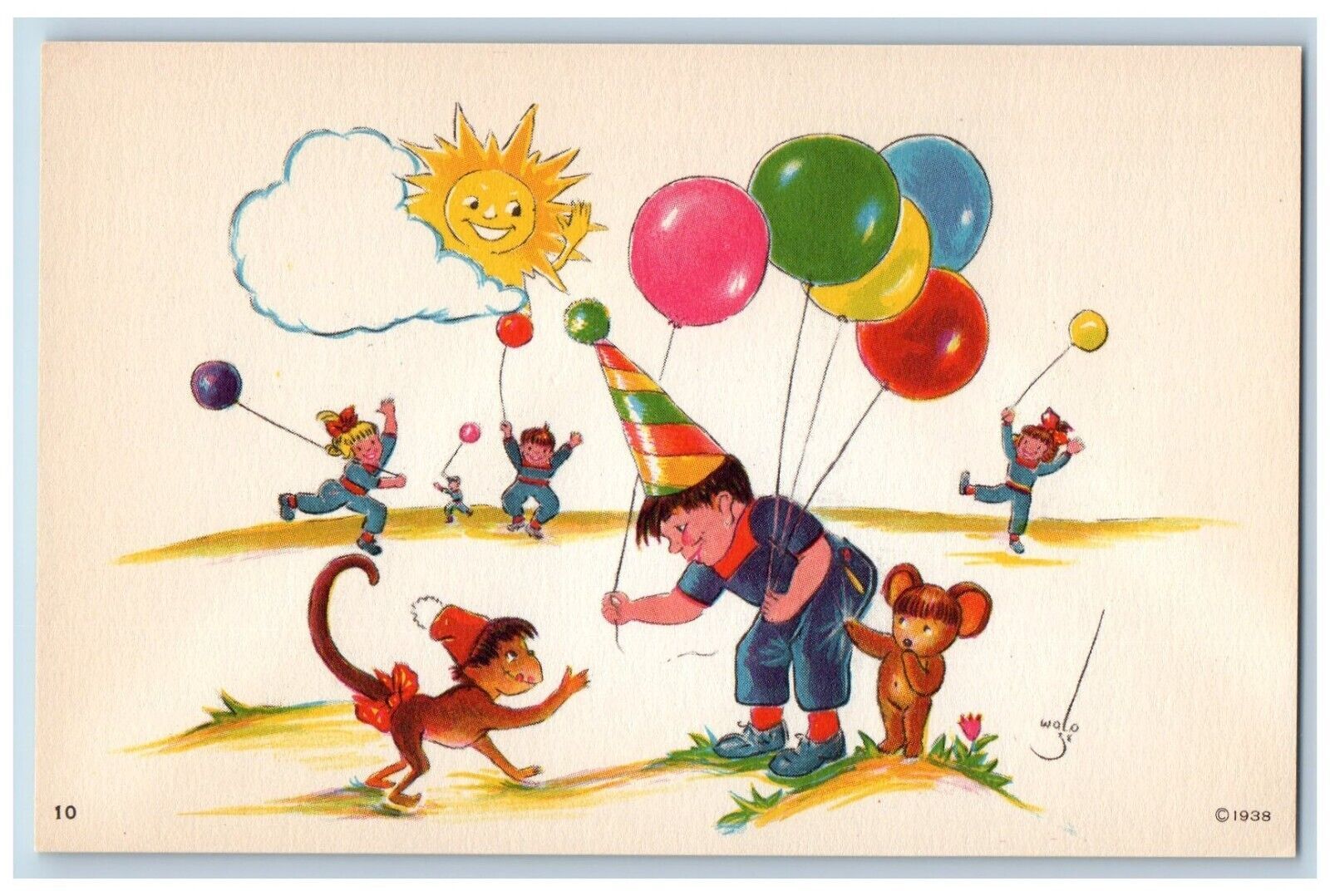 Wolo Signed Postcard Original Painting Boy Balloon Monkey Children Playing