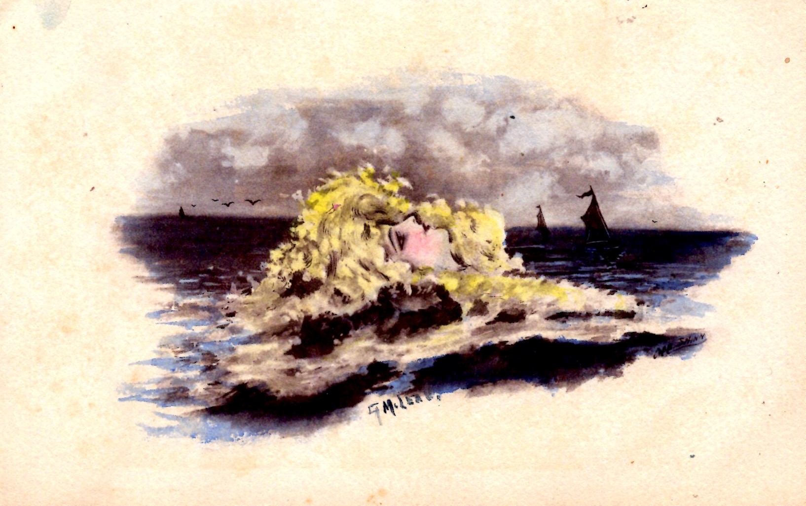 Woman Head emerging from the Ocean - Sailboats - c1908