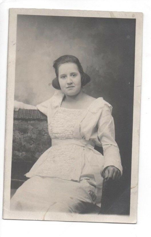 RPPC Real Photo Postcard Woman posing.Vintage postcard with stains corner wear surfacewear edgewear yellowing foxing bumped corners and other characteristics of old vintage postcards. Cards are mailed in rigid cardboard. Ship to USA only.