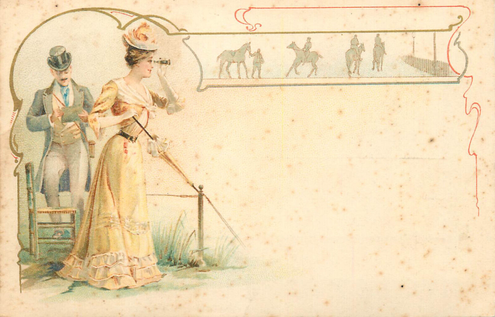 Woman with spy glass horses jockeys art nouveau 1900s chromo litho postcard