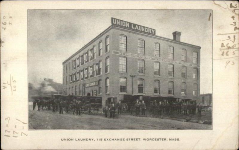 Worcester MA Union Laundry Bldg Delivery Wagons c1910 Postcard