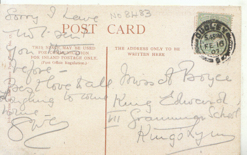 Mo's PostcardsPostcard Description: Worcestershire Postcard - The Keep - Dudley CastleGenealogy: Used - 1907 - Miss A Boyce - King Edward V11 Grammar School - Kings Lynn Defect(s) Very slight wear to bottom left hand corner Postage & Payment: For U.K residents the quoted P & P fee is for any number of postcards purchased at one time. Happy to quote for non UK residents. For multiple purchases please wait for an invoice