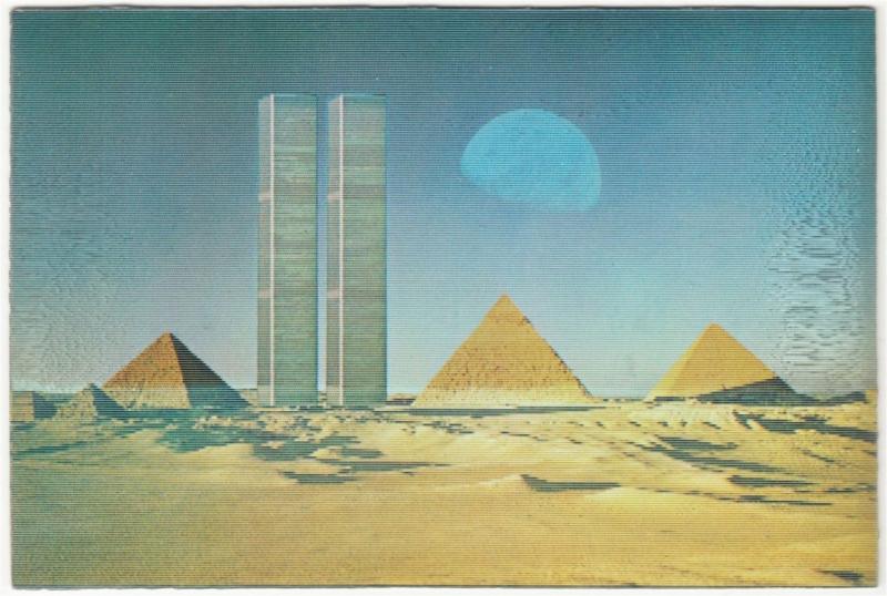 A flicker postcard of the artwork _Two in Time_ by artist Michael Langenstein. When the postcard is moved, the image alternates between two views: the twin towers of the World Trade Center on the moon with the Earth in the sky behind them, and the twin towers next to three pyramids in Egypt.