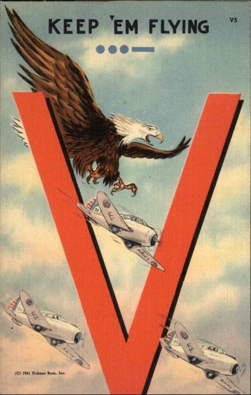 WORLD WAR II WWII Eagle w Fighter Planes & V "Keep Em Flying" LINEN Postcard