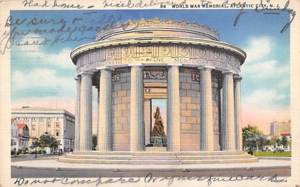 World War Memorial Atlantic City, New Jersey Postcard Postal Date: 1934 Grade: 3 Size: Regular Size Postcard - approximately 3 1/2 inch x 5 1/2 inch (9 CM x 14 CM) Grading Scale: Grade 1 = Perfect corners Gra ... Read More