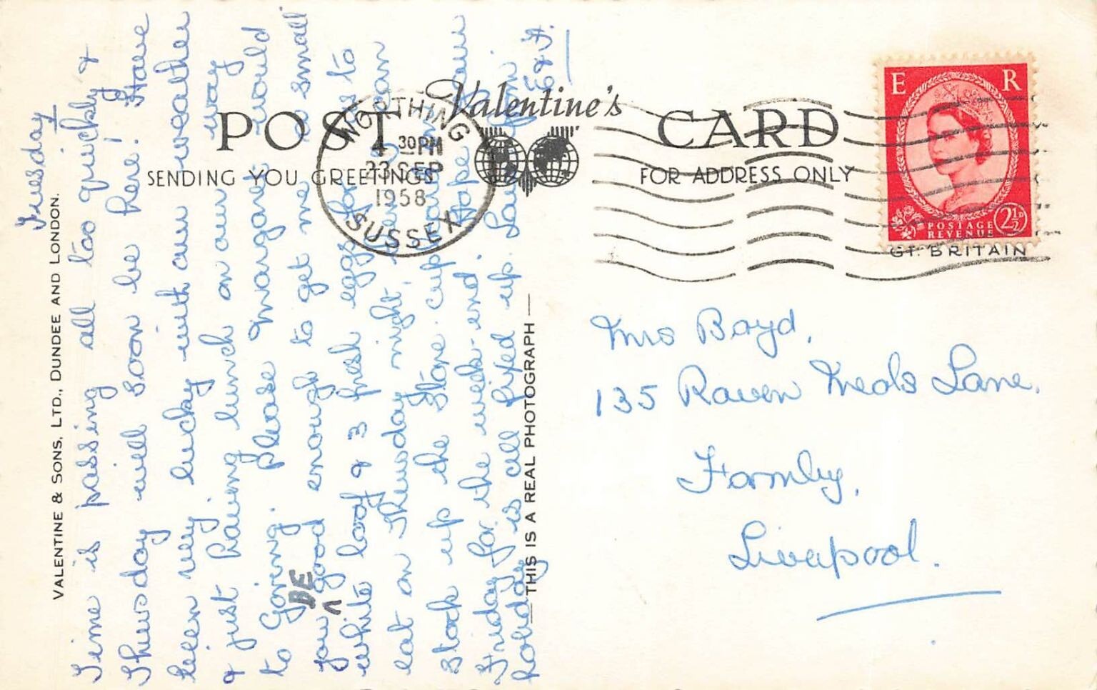 This captivating vintage real photo postcard showcases a bustling scene of Worthing Pier and Esplanade, a prominent landmark on the Sussex coast. The detailed image captures the lively atmosphere of a mid-20th century day, with numerous people strolling along the promenade, classic automobiles lining the street, and the iconic pier stretching out into the English Channel. The architecture of the pier pavilion, with its distinctive domed roof, is clearly visible, offering a glimpse into seaside leisure and popular holiday destinations of the era.Produced by the renowned publisher Valentine & Sons, Ltd., this postcard is a testament to their quality photographic prints. The reverse features a September 1958 postmark from Worthing, Sussex, along with a handwritten message and a Great Britain postage stamp, adding to its historical charm and authenticity. This collectible RPPC offers a vivid historical record of Worthing's vibrant coastal life, making it a desirable piece for enthusiasts of British history, Sussex memorabilia, and vintage photography.