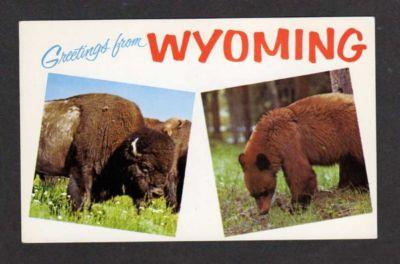 WY Greetings from WYOMING Postcard PC with View of Buffalo & Brown Bear Lot Details This is a Standard size postcard (3 1/2" by 5 1/2") with some corner and edge wear & some surface wear on front of card (few marks ... Read More