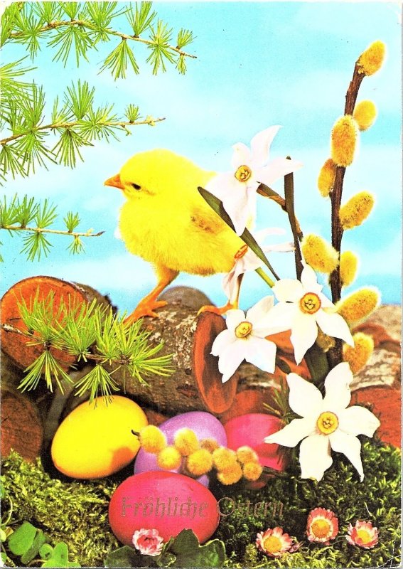 This vibrant vintage postcard features a charming yellow chick surrounded by spring flowers, colorful Easter eggs, and budding tree branches. Printed in a photochrome style typical of the 1939-Now era, the bright and cheerful imagery captures the essence of Easter and springtime celebration. The lithograph printing technique used provides rich, saturated colors and fine detail, emphasizing the natural textures of the moss, flowers, and feathers.The postcard is a licensed reprint printed in Germany during the 1960s, making it a collectible piece for enthusiasts of mid-20th-century holiday postcards. The reverse side includes handwritten notes, a German postage stamp, and an airmail sticker indicating international mailing to California, USA. This combination of vintage art, historic postal markings, and seasonal theme makes it a unique addition to any postcard or Easter memorabilia collection.