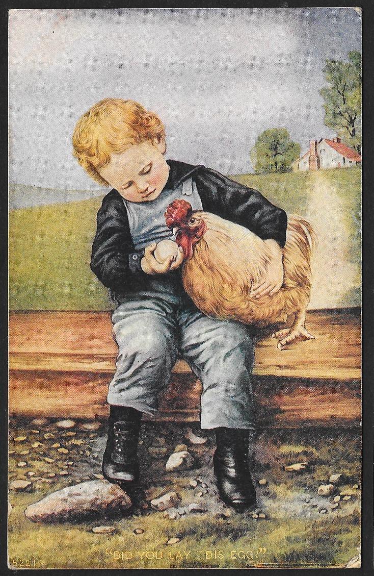 Young Boy in Overalls Holding an Egg & Chicken Used c1909