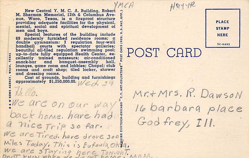 Young Men Christian Association Waco Texas Postcard - Writing on Back
