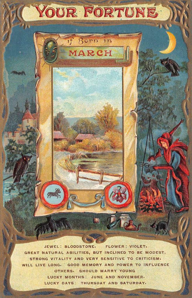 YOUR FORTUNE MARCH ASTROLOGY WITCH HALLOWEEN ESQUE EMBOSSED POSTCARD c. 1910