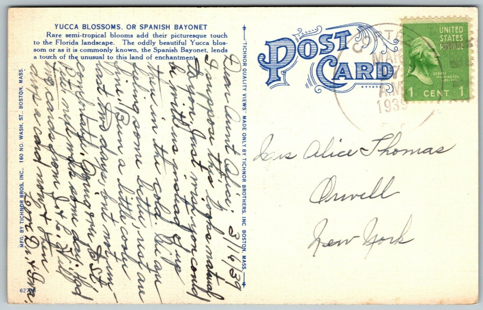 Yucca Blossoms, or Spanish Bayonet, Florida You will receive the exact card pictured in the scans. Size: Standard Size - 3.5" by 5.5". Condition: Please carefully examine scans of the front and back of the card ... Read More