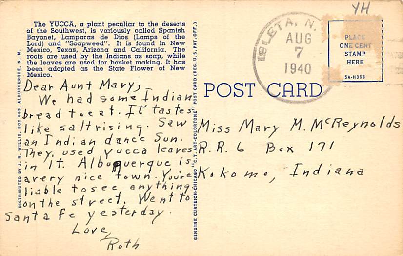Yucca State Flower, New Mexico NM Postcards Grade: 2 Size: Regular Size Postcard - approximately 3 1/2 inch x 5 1/2 inch (9 CM x 14 CM) Grading Scale: Grade 1 = Perfect corners Grade 2 = Very Minimal corner wea ... Read More