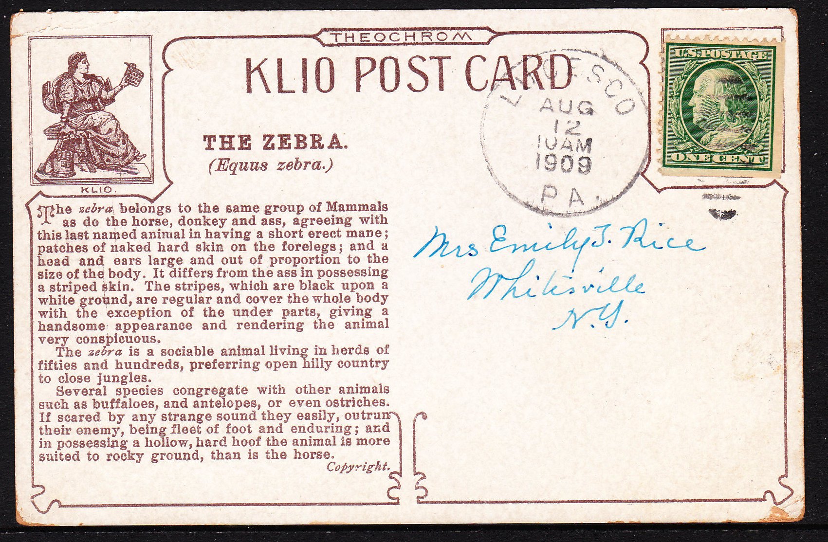 Zebra card - 1909 - Theochrom Klio Post Card