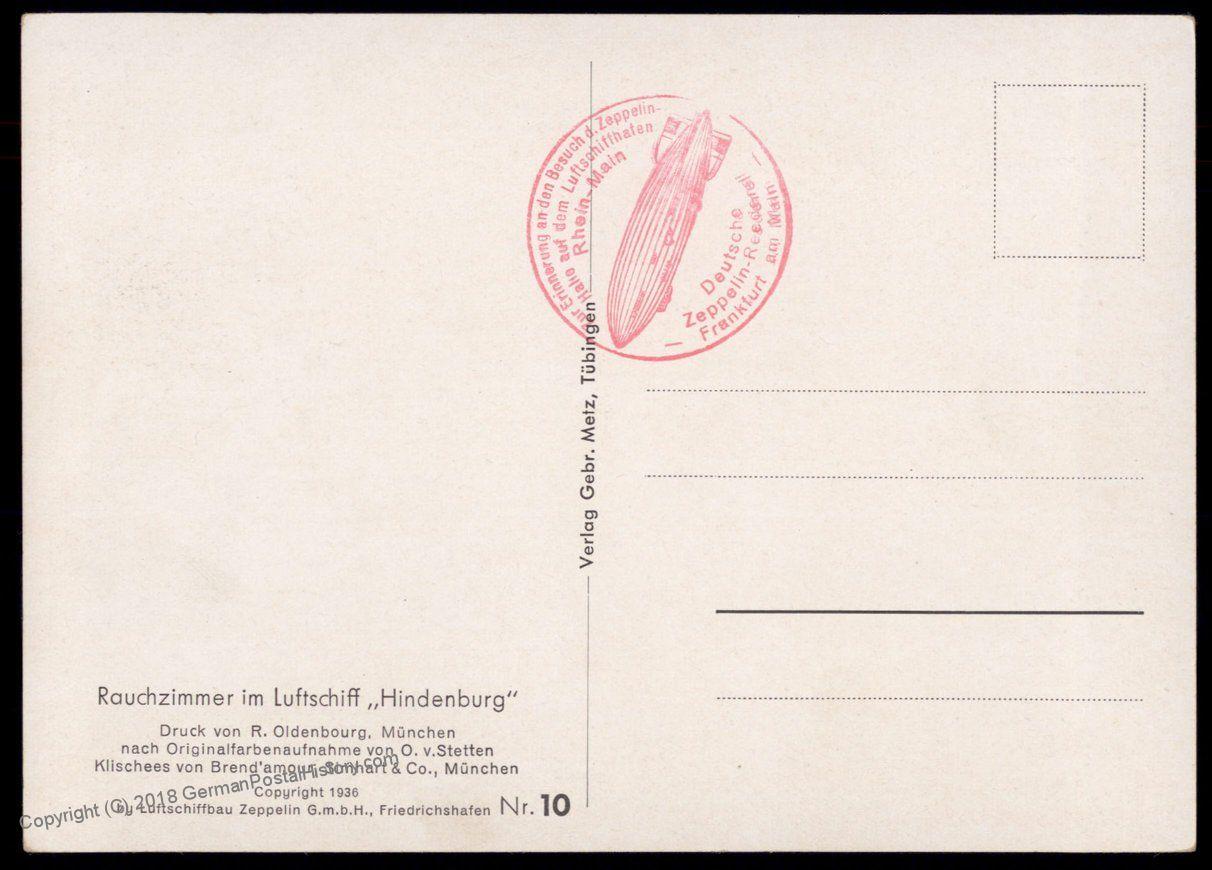 Franking: Used Our Item#: 80061 Hindenburg Rauchzimmer: original, period postcard showing the interior of the Hindenburg Zeppelin. With original Friedrichshafen Zeppelin Factory and Airfield cachet from the 1930s ... Read More
