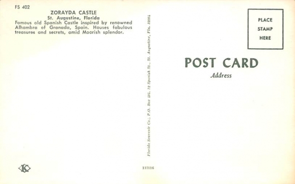 Zorayda Castle St Augustine, Florida Postcard - Unused