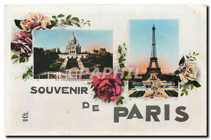 Old postcard Remembrance Paris Eiffel Tower Sacre C�ur Montmartre